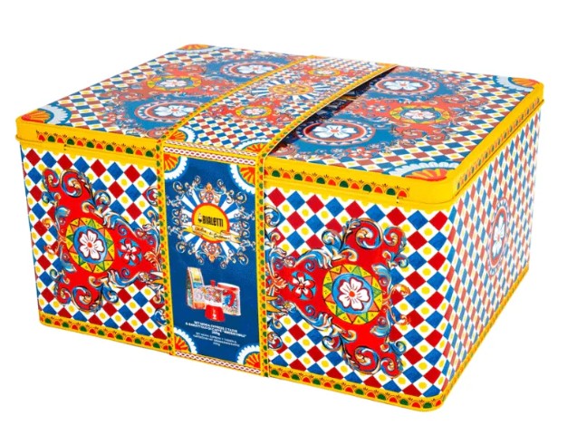 La cafetière moka elle-même, une œuvre d'art fièrement exposée dans la collection permanente du MoMA de New York, rend hommage à l'artisanat, aux paysages et aux couleurs uniques de la Sicile.
