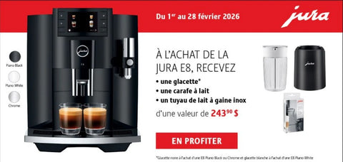 --- À l'achat d'une machine Jura E8, obtenez 145 à 150$ de produits Jura --- (varie selon la couleur et sur prix régulier)